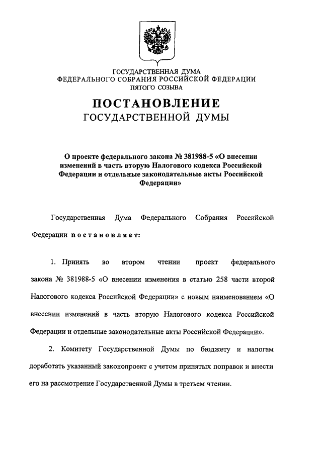"О ПРОЕКТЕ ФЕДЕРАЛЬНОГО ЗАКОНА N 381988-5 "О ВНЕСЕНИИ ИЗМЕНЕНИЙ В ЧАСТЬ ВТОРУЮ НАЛОГОВОГО КОДЕКСА РОССИЙСКОЙ ФЕДЕРАЦИИ И ОТДЕЛЬНЫЕ ЗАКОНОДАТЕЛЬНЫЕ АКТЫ РОССИЙСКОЙ ФЕДЕРАЦИИ"