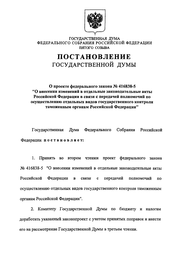 "О ПРОЕКТЕ ФЕДЕРАЛЬНОГО ЗАКОНА N 416838-5 "О ВНЕСЕНИИ ИЗМЕНЕНИЙ В ОТДЕЛЬНЫЕ ЗАКОНОДАТЕЛЬНЫЕ АКТЫ РОССИЙСКОЙ ФЕДЕРАЦИИ В СВЯЗИ С ПЕРЕДАЧЕЙ ПОЛНОМОЧИЙ ПО ОСУЩЕСТВЛЕНИЮ ОТДЕЛЬНЫХ ВИДОВ ГОСУДАРСТВЕННОГО КОНТРОЛЯ ТАМОЖЕННЫМ ОРГАНАМ РОССИЙСКОЙ ФЕДЕРАЦИИ"