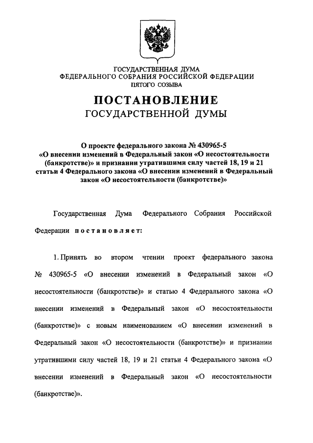 "О ВНЕСЕНИИ ИЗМЕНЕНИЙ В ФЕДЕРАЛЬНЫЙ ЗАКОН "О НЕСОСТОЯТЕЛЬНОСТИ