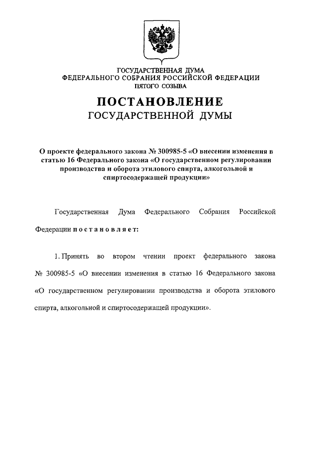 "О ПРОЕКТЕ ФЕДЕРАЛЬНОГО ЗАКОНА N 300985-5 "О ВНЕСЕНИИ ИЗМЕНЕНИЯ В СТАТЬЮ 16 ФЕДЕРАЛЬНОГО ЗАКОНА "О ГОСУДАРСТВЕННОМ РЕГУЛИРОВАНИИ ПРОИЗВОДСТВА И ОБОРОТА ЭТИЛОВОГО СПИРТА, АЛКОГОЛЬНОЙ И СПИРТОСОДЕРЖАЩЕЙ ПРОДУКЦИИ"