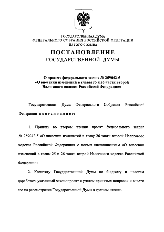 "О ПРОЕКТЕ ФЕДЕРАЛЬНОГО ЗАКОНА N 259042-5 "О ВНЕСЕНИИ ИЗМЕНЕНИЙ В ГЛАВЫ 25 И 26 ЧАСТИ ВТОРОЙ НАЛОГОВОГО КОДЕКСА РОССИЙСКОЙ ФЕДЕРАЦИИ"
