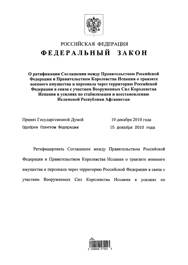 ФЕДЕРАЦИИ И ПРАВИТЕЛЬСТВОМ КОРОЛЕВСТВА ИСПАНИЯ О ТРАНЗИТЕ ВОЕННОГО