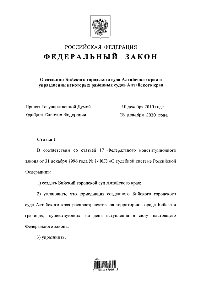 "О СОЗДАНИИ БИЙСКОГО ГОРОДСКОГО СУДА АЛТАЙСКОГО КРАЯ И УПРАЗДНЕНИИ НЕКОТОРЫХ РАЙОННЫХ СУДОВ АЛТАЙСКОГО КРАЯ"