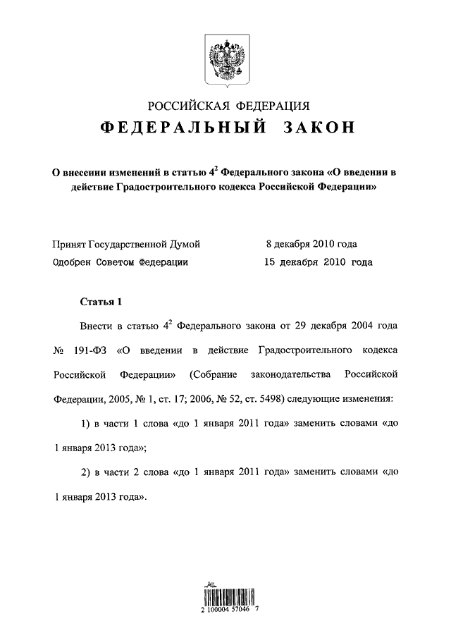 "О ВНЕСЕНИИ ИЗМЕНЕНИЙ В СТАТЬЮ 4.2 ФЕДЕРАЛЬНОГО ЗАКОНА "О ВВЕДЕНИИ В ДЕЙСТВИЕ ГРАДОСТРОИТЕЛЬНОГО КОДЕКСА РОССИЙСКОЙ ФЕДЕРАЦИИ"