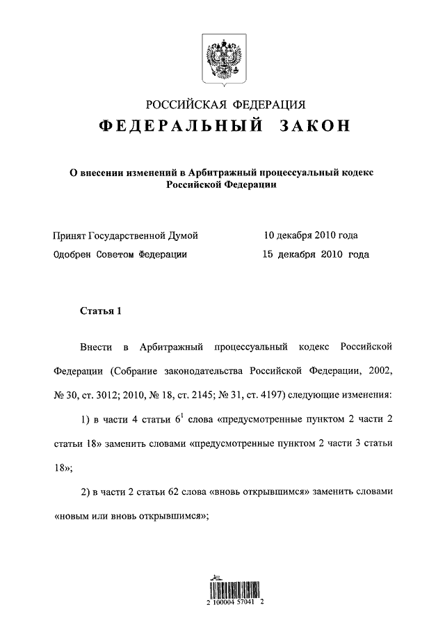 "О ВНЕСЕНИИ ИЗМЕНЕНИЙ В АРБИТРАЖНЫЙ ПРОЦЕССУАЛЬНЫЙ КОДЕКС РОССИЙСКОЙ ФЕДЕРАЦИИ"