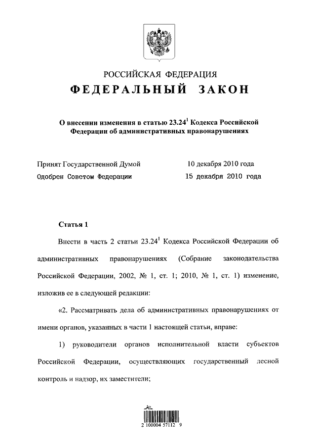 "О ВНЕСЕНИИ ИЗМЕНЕНИЯ В СТАТЬЮ 23.24.1 КОДЕКСА РОССИЙСКОЙ ФЕДЕРАЦИИ ОБ АДМИНИСТРАТИВНЫХ ПРАВОНАРУШЕНИЯХ"