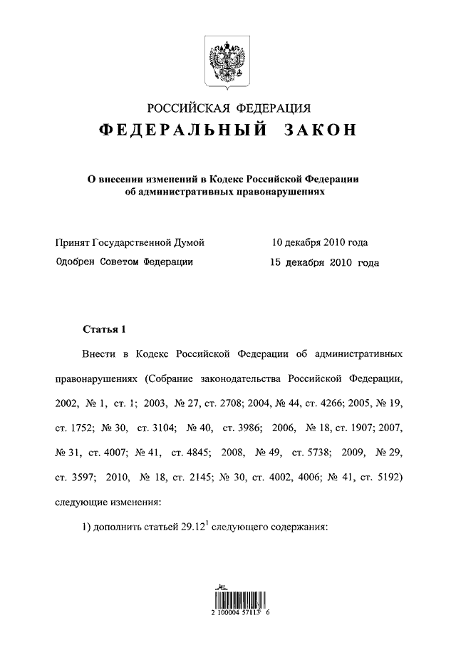 "О ВНЕСЕНИИ ИЗМЕНЕНИЙ В КОДЕКС РОССИЙСКОЙ ФЕДЕРАЦИИ ОБ АДМИНИСТРАТИВНЫХ ПРАВОНАРУШЕНИЯХ"