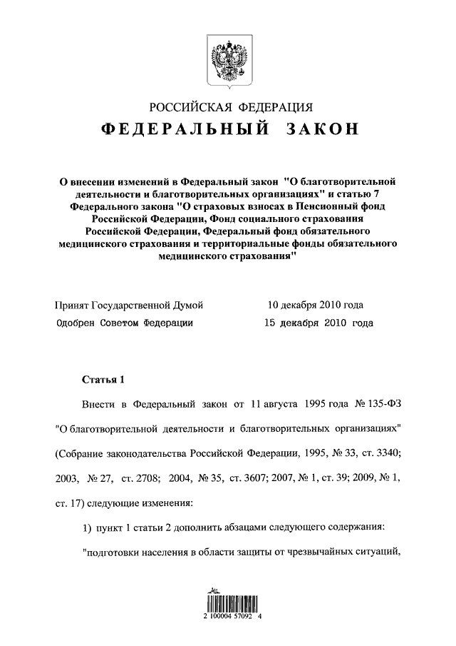 "О ВНЕСЕНИИ ИЗМЕНЕНИЙ В ФЕДЕРАЛЬНЫЙ ЗАКОН "О БЛАГОТВОРИТЕЛЬНОЙ