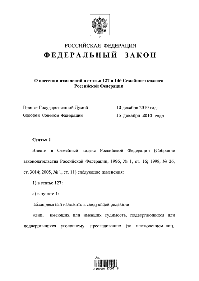 "О ВНЕСЕНИИ ИЗМЕНЕНИЙ В СТАТЬИ 127 И 146 СЕМЕЙНОГО КОДЕКСА РОССИЙСКОЙ ФЕДЕРАЦИИ"