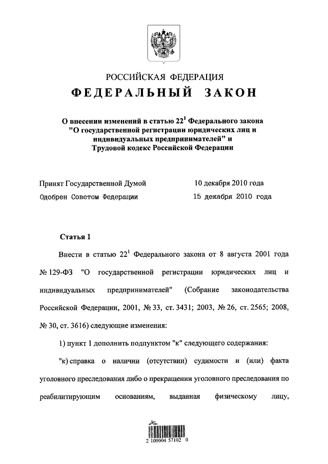 "О ВНЕСЕНИИ ИЗМЕНЕНИЙ В СТАТЬЮ 22.1 ФЕДЕРАЛЬНОГО ЗАКОНА "О ГОСУДАРСТВЕННОЙ РЕГИСТРАЦИИ ЮРИДИЧЕСКИХ ЛИЦ И ИНДИВИДУАЛЬНЫХ ПРЕДПРИНИМАТЕЛЕЙ" И ТРУДОВОЙ КОДЕКС РОССИЙСКОЙ ФЕДЕРАЦИИ"