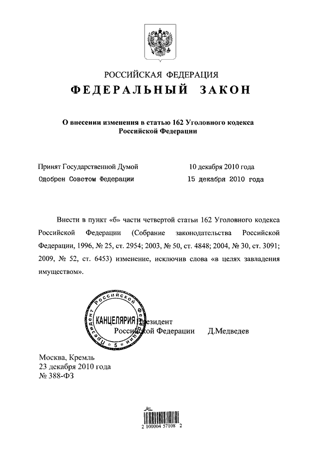"О ВНЕСЕНИИ ИЗМЕНЕНИЯ В СТАТЬЮ 162 УГОЛОВНОГО КОДЕКСА РОССИЙСКОЙ ФЕДЕРАЦИИ"