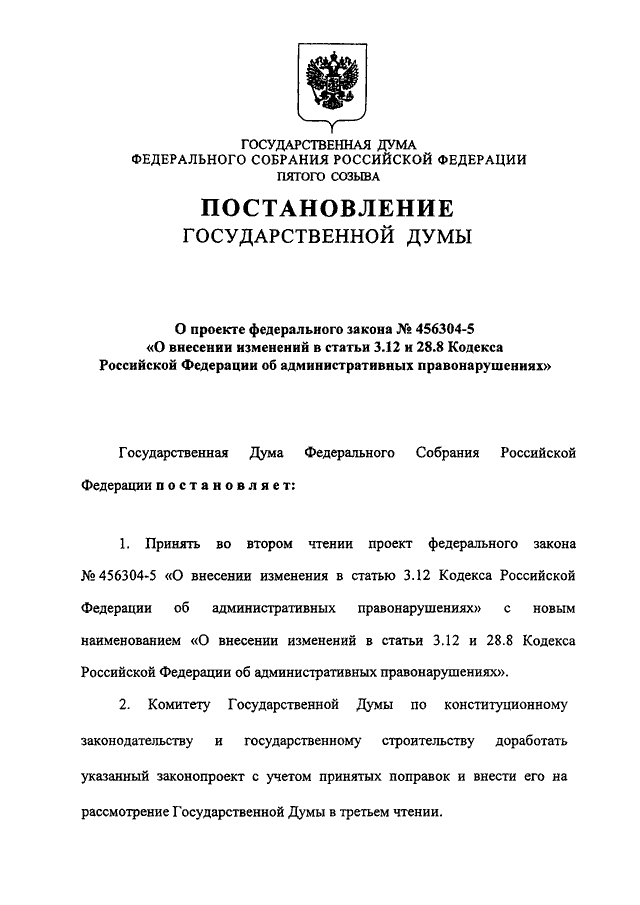 "О ПРОЕКТЕ ФЕДЕРАЛЬНОГО ЗАКОНА N 456304-5 "О ВНЕСЕНИИ ИЗМЕНЕНИЙ В СТАТЬИ 3.12 И 28.8 КОДЕКСА РОССИЙСКОЙ ФЕДЕРАЦИИ ОБ АДМИНИСТРАТИВНЫХ ПРАВОНАРУШЕНИЯХ"