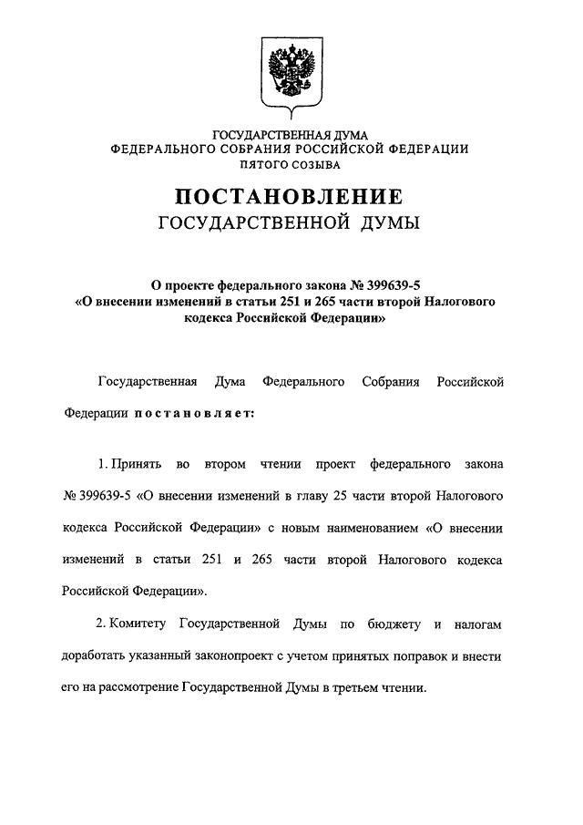 "О ПРОЕКТЕ ФЕДЕРАЛЬНОГО ЗАКОНА N 399639-5 "О ВНЕСЕНИИ ИЗМЕНЕНИЙ В СТАТЬИ 251 И 265 ЧАСТИ ВТОРОЙ НАЛОГОВОГО КОДЕКСА РОССИЙСКОЙ ФЕДЕРАЦИИ"