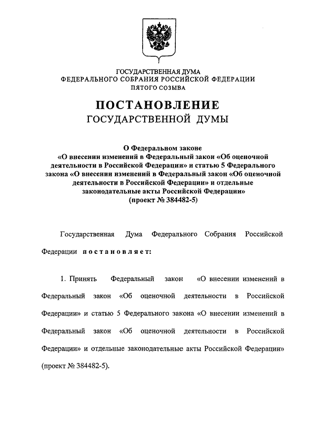 ЗАКОНОДАТЕЛЬНЫЕ АКТЫ РОССИЙСКОЙ ФЕДЕРАЦИИ" (ПРОЕКТ N 384482-5)"