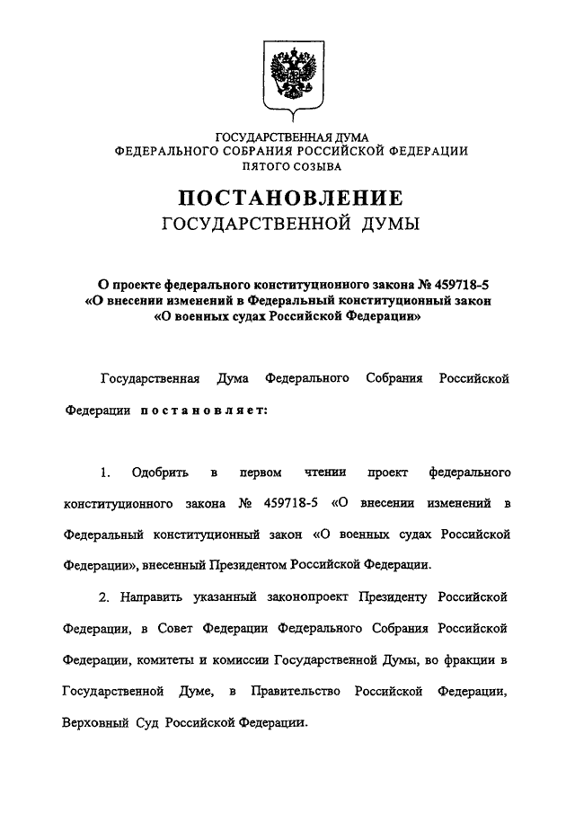 "О ПРОЕКТЕ ФЕДЕРАЛЬНОГО КОНСТИТУЦИОННОГО ЗАКОНА N 459718-5 "О ВНЕСЕНИИ ИЗМЕНЕНИЙ В ФЕДЕРАЛЬНЫЙ КОНСТИТУЦИОННЫЙ ЗАКОН "О ВОЕННЫХ СУДАХ РОССИЙСКОЙ ФЕДЕРАЦИИ"