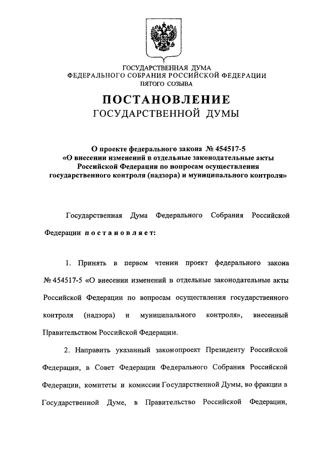 "О ПРОЕКТЕ ФЕДЕРАЛЬНОГО ЗАКОНА N 454517-5 "О ВНЕСЕНИИ ИЗМЕНЕНИЙ В ОТДЕЛЬНЫЕ ЗАКОНОДАТЕЛЬНЫЕ АКТЫ РОССИЙСКОЙ ФЕДЕРАЦИИ ПО ВОПРОСАМ ОСУЩЕСТВЛЕНИЯ ГОСУДАРСТВЕННОГО КОНТРОЛЯ (НАДЗОРА) И МУНИЦИПАЛЬНОГО КОНТРОЛЯ"