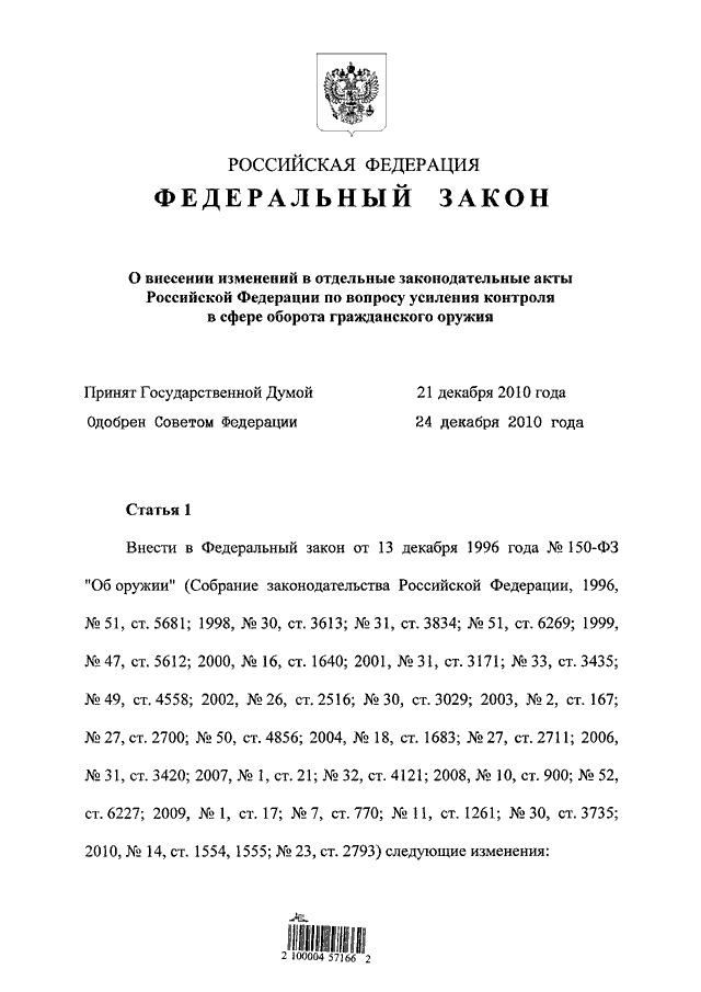 "О ВНЕСЕНИИ ИЗМЕНЕНИЙ В ОТДЕЛЬНЫЕ ЗАКОНОДАТЕЛЬНЫЕ АКТЫ РОССИЙСКОЙ ФЕДЕРАЦИИ ПО ВОПРОСУ УСИЛЕНИЯ КОНТРОЛЯ В СФЕРЕ ОБОРОТА ГРАЖДАНСКОГО ОРУЖИЯ"