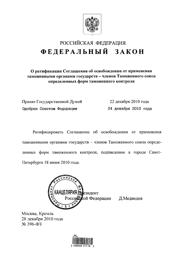 ФЕДЕРАЛЬНЫЙ ЗАКОН от 28.12.2010 N 396-ФЗ