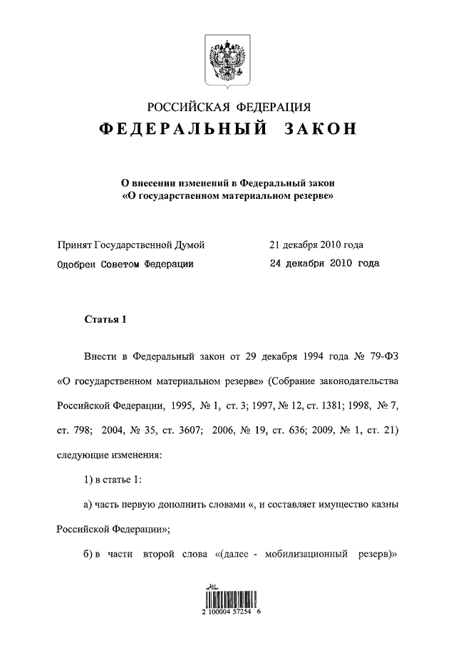 "О ВНЕСЕНИИ ИЗМЕНЕНИЙ В ФЕДЕРАЛЬНЫЙ ЗАКОН "О ГОСУДАРСТВЕННОМ МАТЕРИАЛЬНОМ РЕЗЕРВЕ"