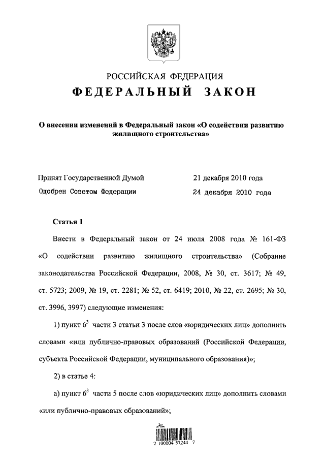 "О ВНЕСЕНИИ ИЗМЕНЕНИЙ В ФЕДЕРАЛЬНЫЙ ЗАКОН "О СОДЕЙСТВИИ РАЗВИТИЮ ЖИЛИЩНОГО СТРОИТЕЛЬСТВА"