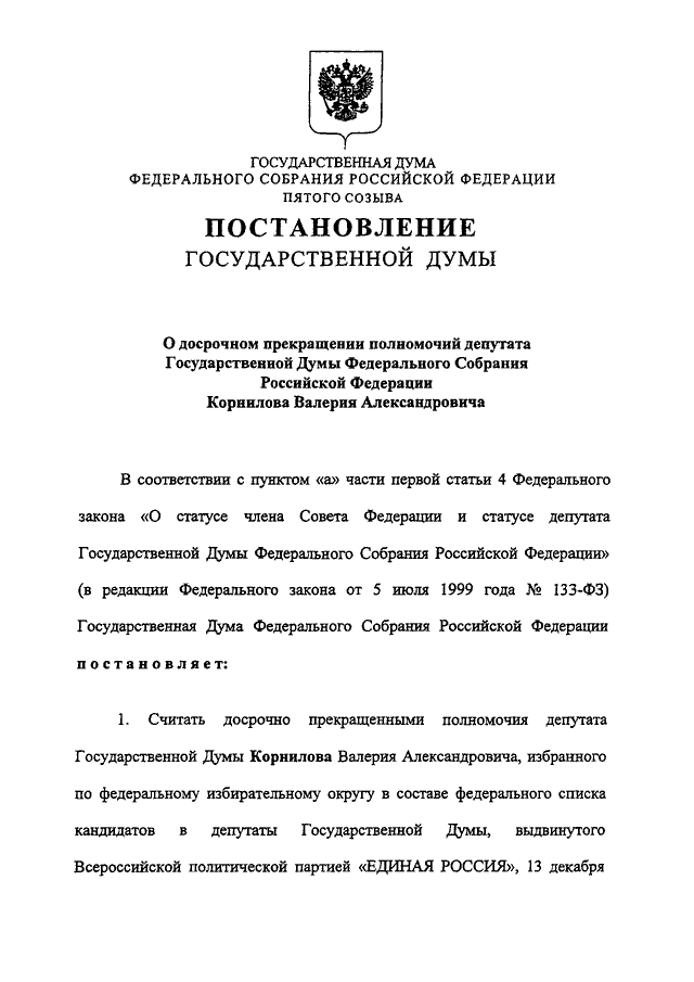 "О ДОСРОЧНОМ ПРЕКРАЩЕНИИ ПОЛНОМОЧИЙ ДЕПУТАТА ГОСУДАРСТВЕННОЙ ДУМЫ ФЕДЕРАЛЬНОГО СОБРАНИЯ РОССИЙСКОЙ ФЕДЕРАЦИИ КОРНИЛОВА ВАЛЕРИЯ АЛЕКСАНДРОВИЧА"
