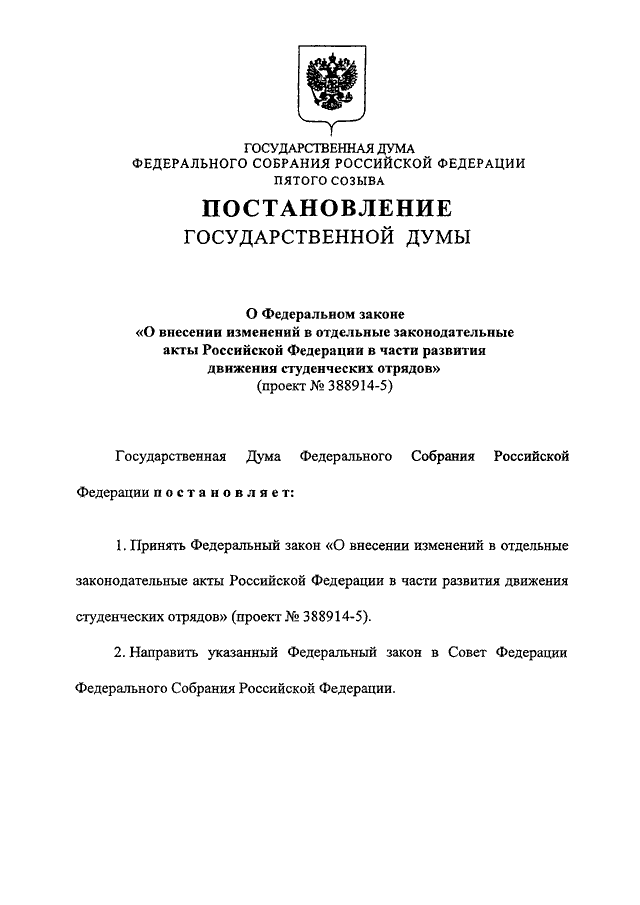 "О ФЕДЕРАЛЬНОМ ЗАКОНЕ "О ВНЕСЕНИИ ИЗМЕНЕНИЙ В ОТДЕЛЬНЫЕ ЗАКОНОДАТЕЛЬНЫЕ АКТЫ РОССИЙСКОЙ ФЕДЕРАЦИИ В ЧАСТИ РАЗВИТИЯ ДВИЖЕНИЯ СТУДЕНЧЕСКИХ ОТРЯДОВ" (ПРОЕКТ N 388914-5)"