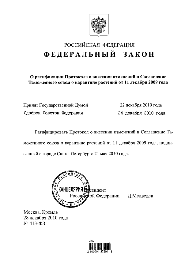 "О РАТИФИКАЦИИ ПРОТОКОЛА О ВНЕСЕНИИ ИЗМЕНЕНИЙ В СОГЛАШЕНИЕ ТАМОЖЕННОГО СОЮЗА О КАРАНТИНЕ РАСТЕНИЙ ОТ 11 ДЕКАБРЯ 2009 ГОДА"
