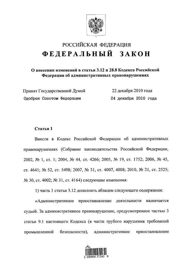 "О ВНЕСЕНИИ ИЗМЕНЕНИЙ В СТАТЬИ 3.12 И 28.8 КОДЕКСА РОССИЙСКОЙ ФЕДЕРАЦИИ ОБ АДМИНИСТРАТИВНЫХ ПРАВОНАРУШЕНИЯХ"