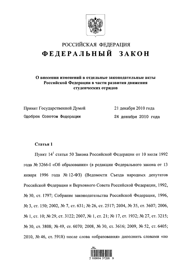 "О ВНЕСЕНИИ ИЗМЕНЕНИЙ В ОТДЕЛЬНЫЕ ЗАКОНОДАТЕЛЬНЫЕ АКТЫ РОССИЙСКОЙ ФЕДЕРАЦИИ В ЧАСТИ РАЗВИТИЯ ДВИЖЕНИЯ СТУДЕНЧЕСКИХ ОТРЯДОВ"