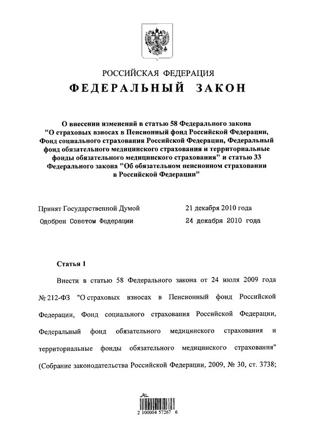 "О ВНЕСЕНИИ ИЗМЕНЕНИЙ В СТАТЬЮ 58 ФЕДЕРАЛЬНОГО ЗАКОНА "О СТРАХОВЫХ ВЗНОСАХ В ПЕНСИОННЫЙ ФОНД РОССИЙСКОЙ ФЕДЕРАЦИИ, ФОНД СОЦИАЛЬНОГО СТРАХОВАНИЯ РОССИЙСКОЙ ФЕДЕРАЦИИ, ФЕДЕРАЛЬНЫЙ ФОНД ОБЯЗАТЕЛЬНОГО МЕДИЦИНСКОГО СТРАХОВАНИЯ И ТЕРРИТОРИАЛЬНЫЕ ФОНДЫ ОБЯЗАТЕЛЬНОГО МЕДИЦИНСКОГО СТРАХОВАНИЯ" И СТАТЬЮ 33 ФЕДЕРАЛЬНОГО ЗАКОНА "ОБ ОБЯЗАТЕЛЬНОМ ПЕНСИОННОМ СТРАХОВАНИИ В РОССИЙСКОЙ ФЕДЕРАЦИИ"