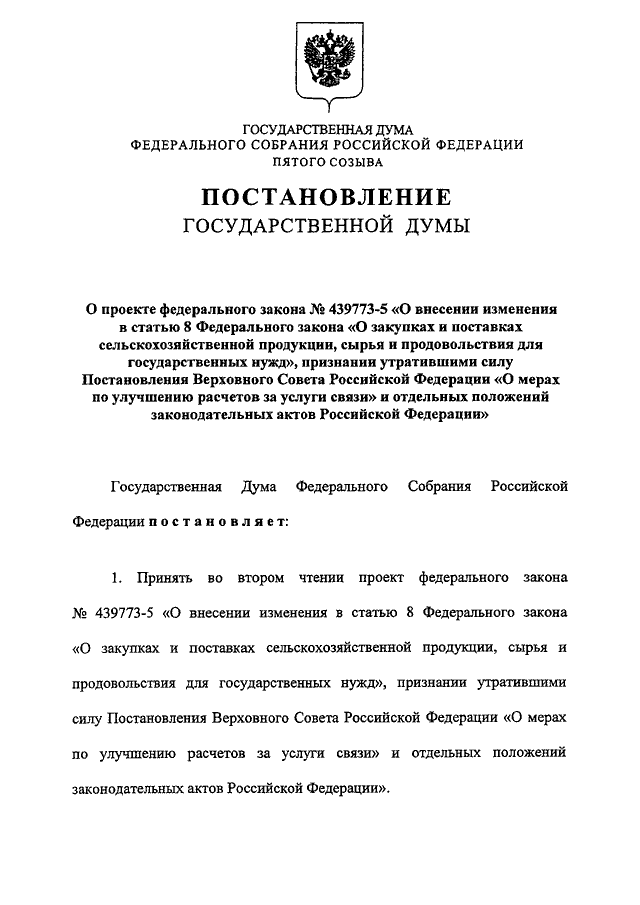 "О ПРОЕКТЕ ФЕДЕРАЛЬНОГО ЗАКОНА N 439773-5 "О ВНЕСЕНИИ ИЗМЕНЕНИЯ В СТАТЬЮ 8 ФЕДЕРАЛЬНОГО ЗАКОНА "О ЗАКУПКАХ И ПОСТАВКАХ СЕЛЬСКОХОЗЯЙСТВЕННОЙ ПРОДУКЦИИ, СЫРЬЯ И ПРОДОВОЛЬСТВИЯ ДЛЯ ГОСУДАРСТВЕННЫХ НУЖД", ПРИЗНАНИИ УТРАТИВШИМИ СИЛУ ПОСТАНОВЛЕНИЯ ВЕРХОВНОГО СОВЕТА РОССИЙСКОЙ ФЕДЕРАЦИИ "О МЕРАХ ПО УЛУЧШЕНИЮ РАСЧЕТОВ ЗА УСЛУГИ СВЯЗИ" И ОТДЕЛЬНЫХ ПОЛОЖЕНИЙ ЗАКОНОДАТЕЛЬНЫХ АКТОВ РОССИЙСКОЙ ФЕДЕРАЦИИ"