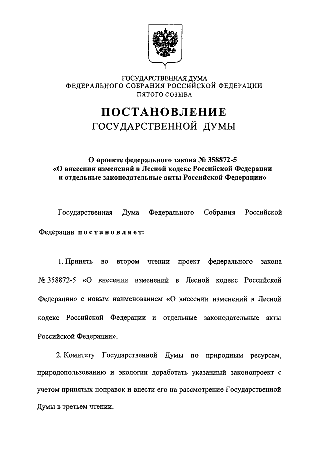 "О ПРОЕКТЕ ФЕДЕРАЛЬНОГО ЗАКОНА N 358872-5 "О ВНЕСЕНИИ ИЗМЕНЕНИЙ В ЛЕСНОЙ КОДЕКС РОССИЙСКОЙ ФЕДЕРАЦИИ И ОТДЕЛЬНЫЕ ЗАКОНОДАТЕЛЬНЫЕ АКТЫ РОССИЙСКОЙ ФЕДЕРАЦИИ"