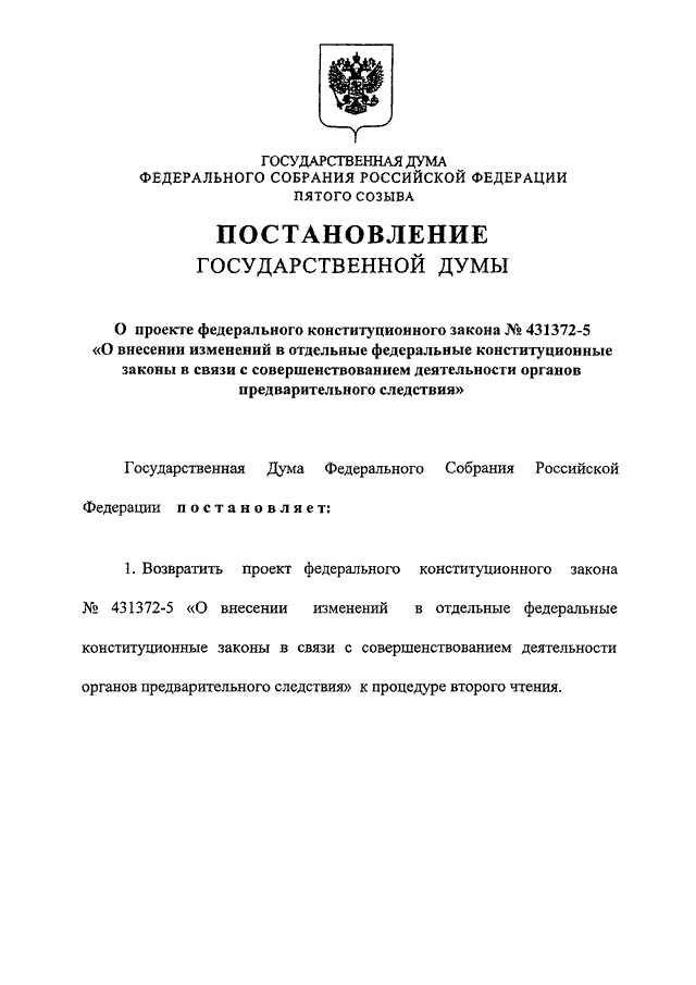 "О ПРОЕКТЕ ФЕДЕРАЛЬНОГО КОНСТИТУЦИОННОГО ЗАКОНА N 431372-5 "О ВНЕСЕНИИ ИЗМЕНЕНИЙ В ОТДЕЛЬНЫЕ ФЕДЕРАЛЬНЫЕ КОНСТИТУЦИОННЫЕ ЗАКОНЫ В СВЯЗИ С СОВЕРШЕНСТВОВАНИЕМ ДЕЯТЕЛЬНОСТИ ОРГАНОВ ПРЕДВАРИТЕЛЬНОГО СЛЕДСТВИЯ"