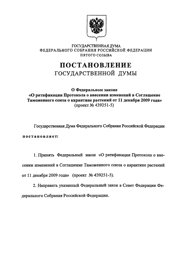 "О ФЕДЕРАЛЬНОМ ЗАКОНЕ "О РАТИФИКАЦИИ ПРОТОКОЛА О ВНЕСЕНИИ ИЗМЕНЕНИЙ В СОГЛАШЕНИЕ ТАМОЖЕННОГО СОЮЗА О КАРАНТИНЕ РАСТЕНИЙ ОТ 11 ДЕКАБРЯ 2009 ГОДА" (ПРОЕКТ N 439251-5)"