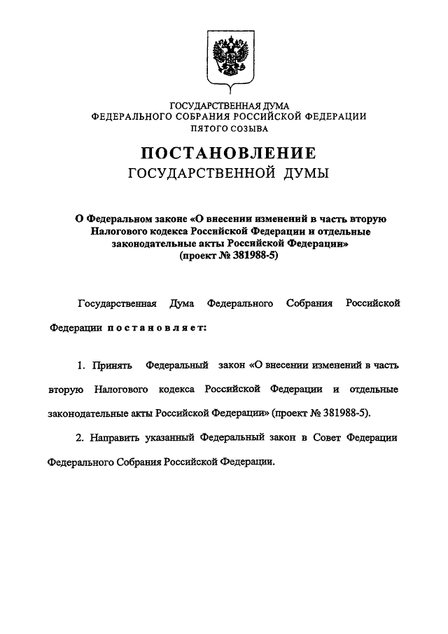 "О ФЕДЕРАЛЬНОМ ЗАКОНЕ "О ВНЕСЕНИИ ИЗМЕНЕНИЙ В ЧАСТЬ ВТОРУЮ НАЛОГОВОГО КОДЕКСА РОССИЙСКОЙ ФЕДЕРАЦИИ И ОТДЕЛЬНЫЕ ЗАКОНОДАТЕЛЬНЫЕ АКТЫ РОССИЙСКОЙ ФЕДЕРАЦИИ" (ПРОЕКТ N 381988-5)"
