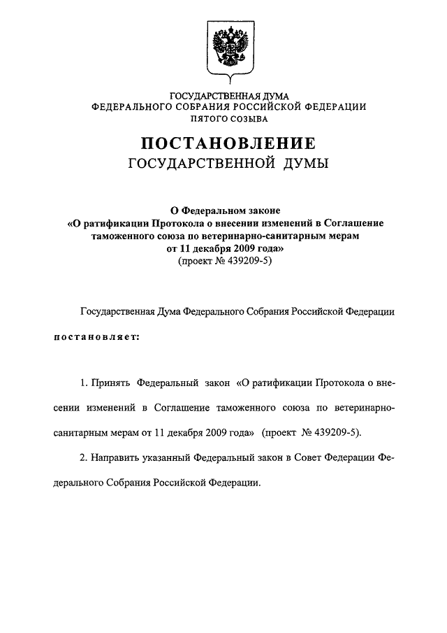 "О ФЕДЕРАЛЬНОМ ЗАКОНЕ "О РАТИФИКАЦИИ ПРОТОКОЛА О ВНЕСЕНИИ ИЗМЕНЕНИЙ В СОГЛАШЕНИЕ ТАМОЖЕННОГО СОЮЗА ПО ВЕТЕРИНАРНО - САНИТАРНЫМ МЕРАМ ОТ 11 ДЕКАБРЯ 2009 ГОДА" (ПРОЕКТ N 439209-5)"