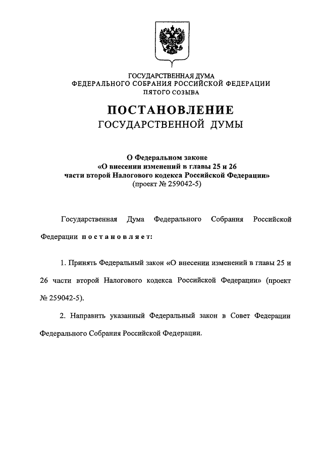 "О ФЕДЕРАЛЬНОМ ЗАКОНЕ "О ВНЕСЕНИИ ИЗМЕНЕНИЙ В ГЛАВЫ 25 И 26 ЧАСТИ ВТОРОЙ НАЛОГОВОГО КОДЕКСА РОССИЙСКОЙ ФЕДЕРАЦИИ" (ПРОЕКТ N 259042-5)"