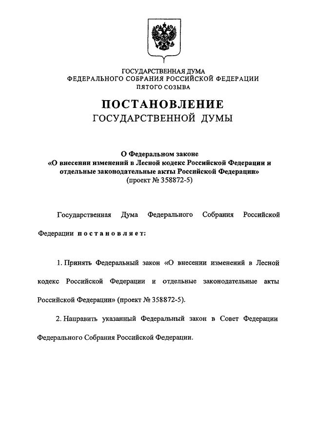 "О ФЕДЕРАЛЬНОМ ЗАКОНЕ "О ВНЕСЕНИИ ИЗМЕНЕНИЙ В ЛЕСНОЙ КОДЕКС РОССИЙСКОЙ ФЕДЕРАЦИИ И ОТДЕЛЬНЫЕ ЗАКОНОДАТЕЛЬНЫЕ АКТЫ РОССИЙСКОЙ ФЕДЕРАЦИИ" (ПРОЕКТ N 358872-5)"