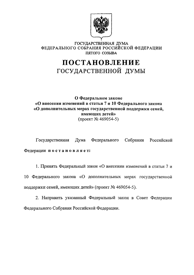 "О ФЕДЕРАЛЬНОМ ЗАКОНЕ "О ВНЕСЕНИИ ИЗМЕНЕНИЙ В СТАТЬИ 7 И 10 ФЕДЕРАЛЬНОГО ЗАКОНА "О ДОПОЛНИТЕЛЬНЫХ МЕРАХ ГОСУДАРСТВЕННОЙ ПОДДЕРЖКИ СЕМЕЙ, ИМЕЮЩИХ ДЕТЕЙ" (ПРОЕКТ N 469054-5)"