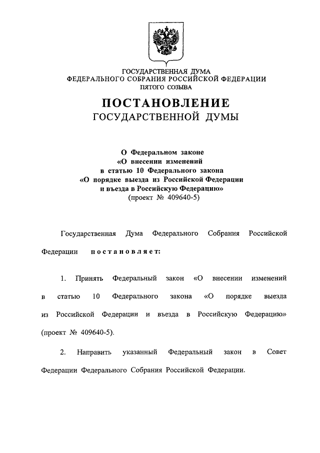 "О ФЕДЕРАЛЬНОМ ЗАКОНЕ "О ВНЕСЕНИИ ИЗМЕНЕНИЙ В СТАТЬЮ 10 ФЕДЕРАЛЬНОГО ЗАКОНА "О ПОРЯДКЕ ВЫЕЗДА ИЗ РОССИЙСКОЙ ФЕДЕРАЦИИ И ВЪЕЗДА В РОССИЙСКУЮ ФЕДЕРАЦИЮ" (ПРОЕКТ N 409640-5)"