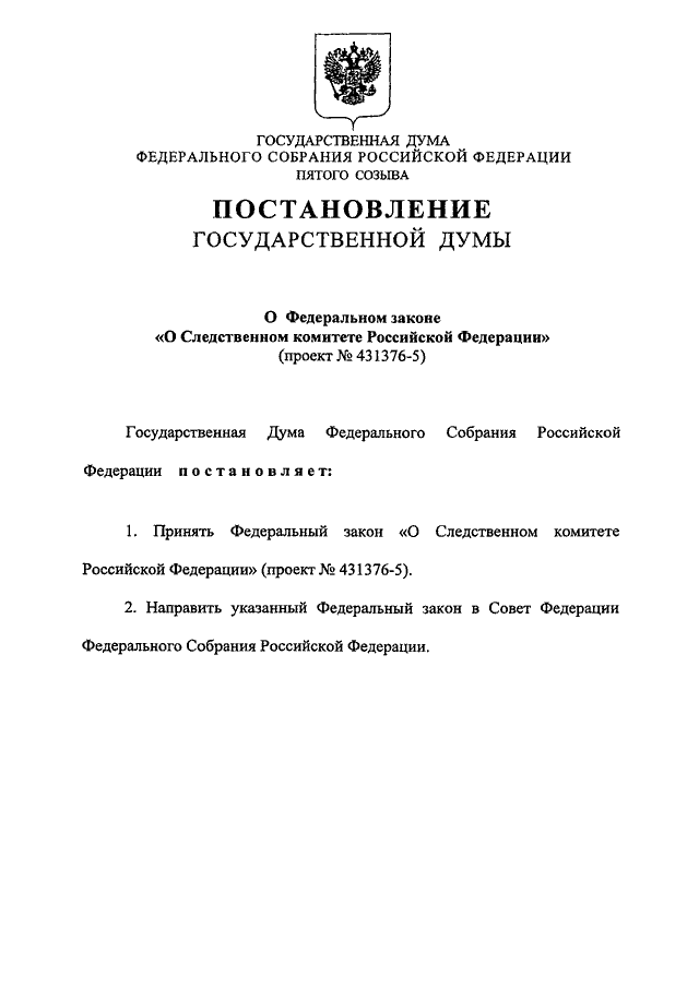 "О ФЕДЕРАЛЬНОМ ЗАКОНЕ "О СЛЕДСТВЕННОМ КОМИТЕТЕ РОССИЙСКОЙ ФЕДЕРАЦИИ" (ПРОЕКТ N 431376-5)"
