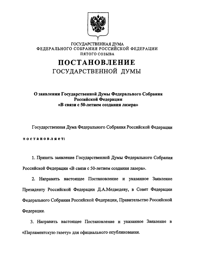 "О ЗАЯВЛЕНИИ ГОСУДАРСТВЕННОЙ ДУМЫ ФЕДЕРАЛЬНОГО СОБРАНИЯ РОССИЙСКОЙ ФЕДЕРАЦИИ "В СВЯЗИ С 50-ЛЕТИЕМ СОЗДАНИЯ ЛАЗЕРА"