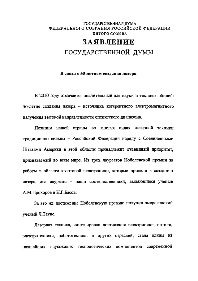 "О ЗАЯВЛЕНИИ ГОСУДАРСТВЕННОЙ ДУМЫ ФЕДЕРАЛЬНОГО СОБРАНИЯ РОССИЙСКОЙ ФЕДЕРАЦИИ "В СВЯЗИ С 50-ЛЕТИЕМ СОЗДАНИЯ ЛАЗЕРА"