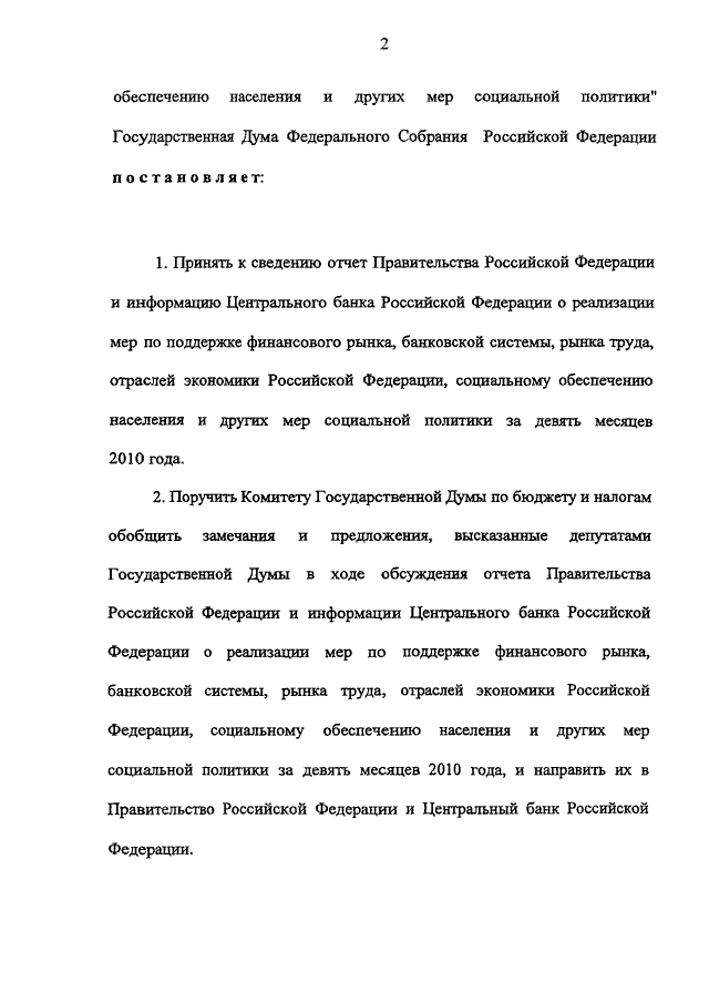 "ОБ ОТЧЕТЕ ПРАВИТЕЛЬСТВА РОССИЙСКОЙ ФЕДЕРАЦИИ И ИНФОРМАЦИИ ЦЕНТРАЛЬНОГО БАНКА РОССИЙСКОЙ ФЕДЕРАЦИИ О РЕАЛИЗАЦИЙ МЕР ПО ПОДДЕРЖКЕ ФИНАНСОВОГО РЫНКА, БАНКОВСКОЙ СИСТЕМЫ, РЫНКА ТРУДА, ОТРАСЛЕЙ ЭКОНОМИКИ РОССИЙСКОЙ ФЕДЕРАЦИИ, СОЦИАЛЬНОМУ ОБЕСПЕЧЕНИЮ НАСЕЛЕНИЯ И ДРУГИХ МЕР СОЦИАЛЬНОЙ ПОЛИТИКИ ЗА ДЕВЯТЬ МЕСЯЦЕВ 2010 ГОДА"