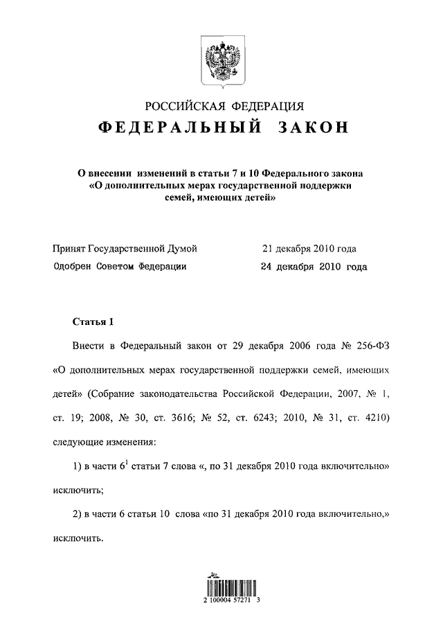"О ВНЕСЕНИИ ИЗМЕНЕНИЙ В СТАТЬИ 7 И 10 ФЕДЕРАЛЬНОГО ЗАКОНА "О ДОПОЛНИТЕЛЬНЫХ МЕРАХ ГОСУДАРСТВЕННОЙ ПОДДЕРЖКИ СЕМЕЙ, ИМЕЮЩИХ ДЕТЕЙ"