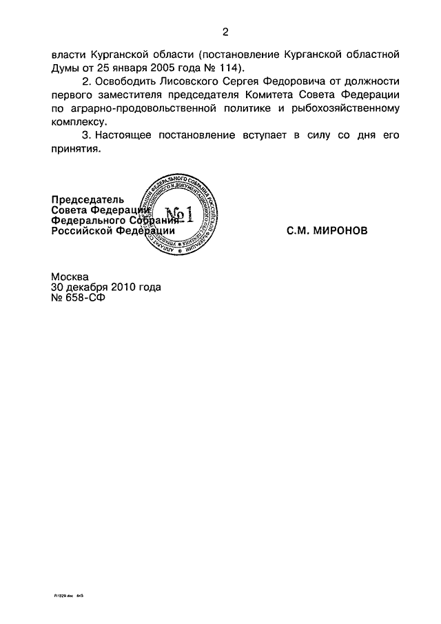 ПОСТАНОВЛЕНИЕ СФ ФС РФ от 30.12.2010 N 658-СФ