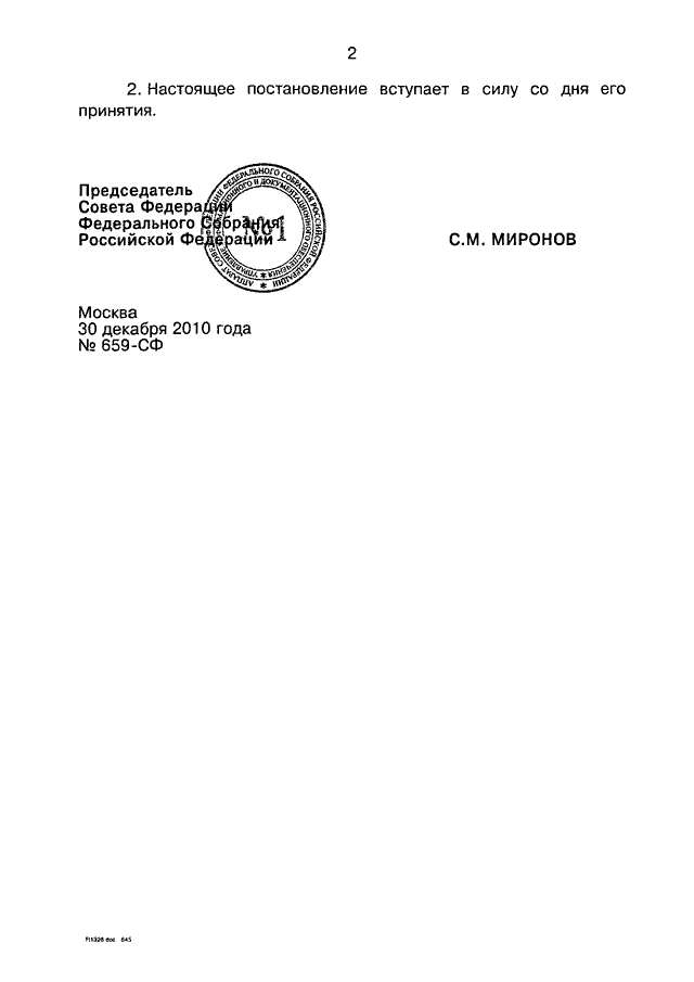ПОСТАНОВЛЕНИЕ СФ ФС РФ от 30.12.2010 N 659-СФ