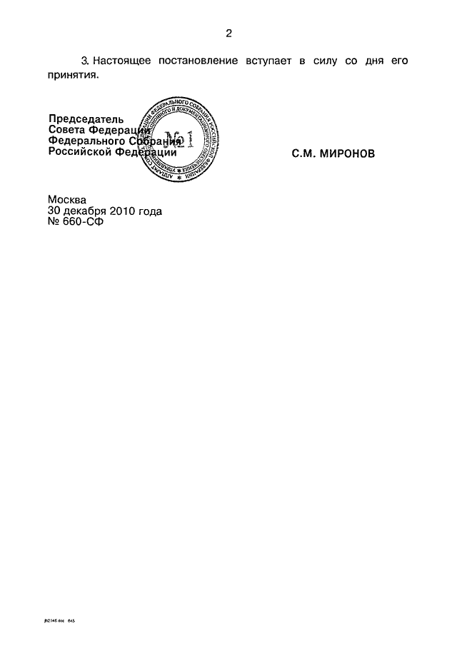 ПОСТАНОВЛЕНИЕ СФ ФС РФ от 30.12.2010 N 660-СФ