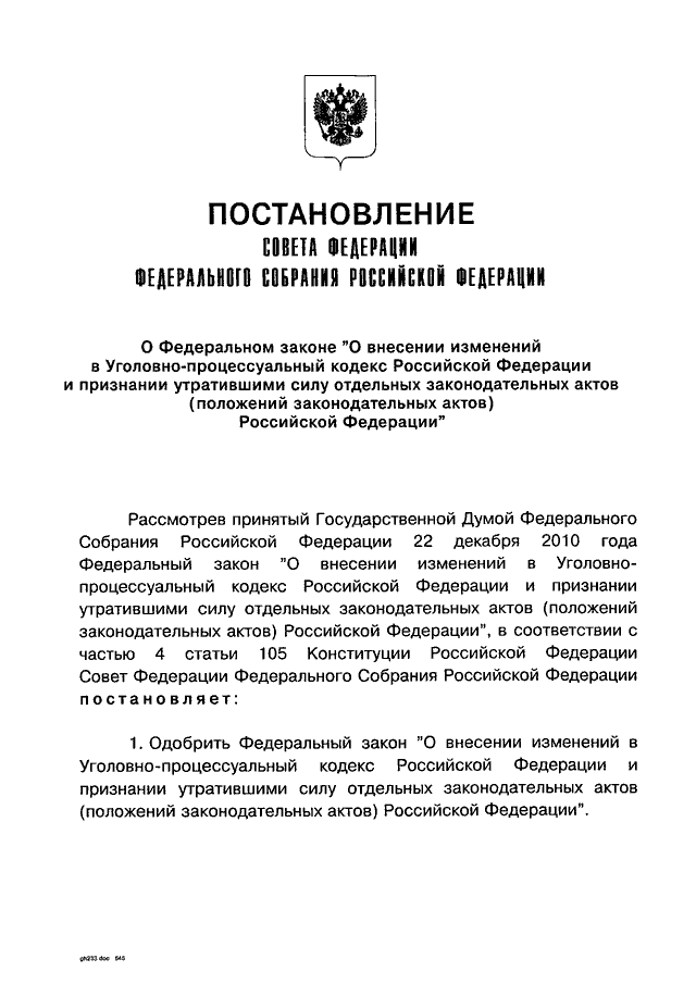 "О ФЕДЕРАЛЬНОМ ЗАКОНЕ "О ВНЕСЕНИИ ИЗМЕНЕНИЙ В УГОЛОВНО - ПРОЦЕССУАЛЬНЫЙ КОДЕКС РОССИЙСКОЙ ФЕДЕРАЦИИ И ПРИЗНАНИИ УТРАТИВШИМИ СИЛУ ОТДЕЛЬНЫХ ЗАКОНОДАТЕЛЬНЫХ АКТОВ (ПОЛОЖЕНИЙ ЗАКОНОДАТЕЛЬНЫХ АКТОВ) РОССИЙСКОЙ ФЕДЕРАЦИИ"