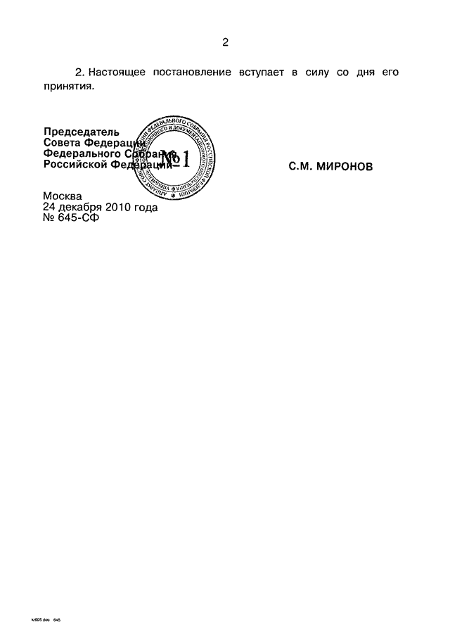 ПОСТАНОВЛЕНИЕ СФ ФС РФ от 24.12.2010 N 645-СФ